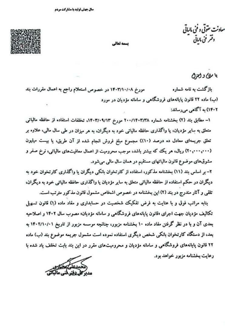 🔹 موضوع: نحوه اجرای ماده ۲۲ قانون پایانههای فروشگاهی درخصوص استفاده از حسابهای شخصی اعضای هیئتمدیره توسط اشخاص حقوقی