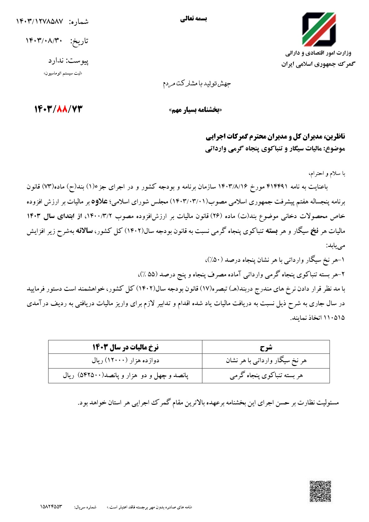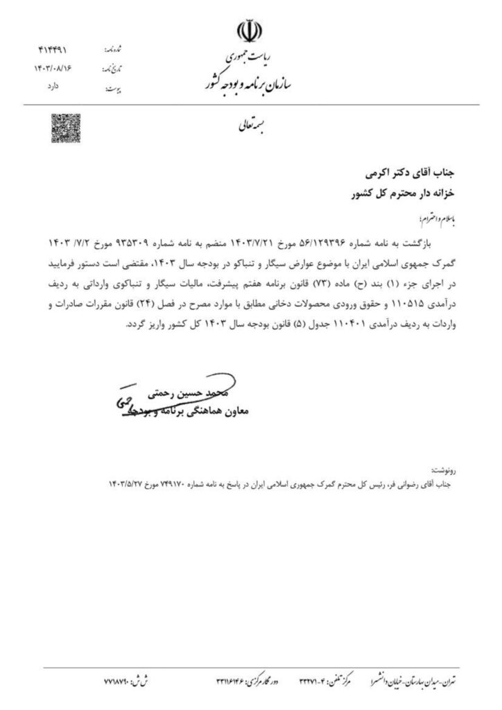بر اساس مصوبه جدید سازمان امور مالیاتی، از ابتدای سال ۱۴۰۳ مالیات هر نخ سیگار وارداتی و هر بسته تنباکوی پنجاه گرمی وارداتی علاوه بر مالیات بر ارزش افزوده، افزایش خواهد یافت.