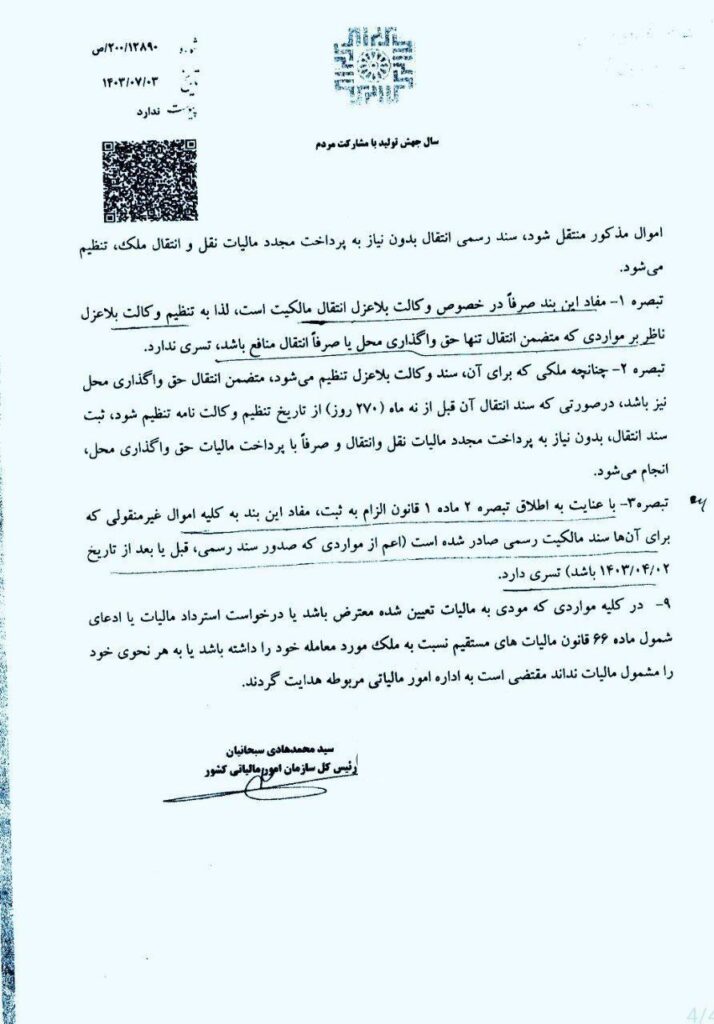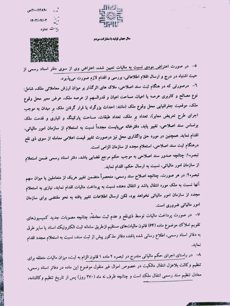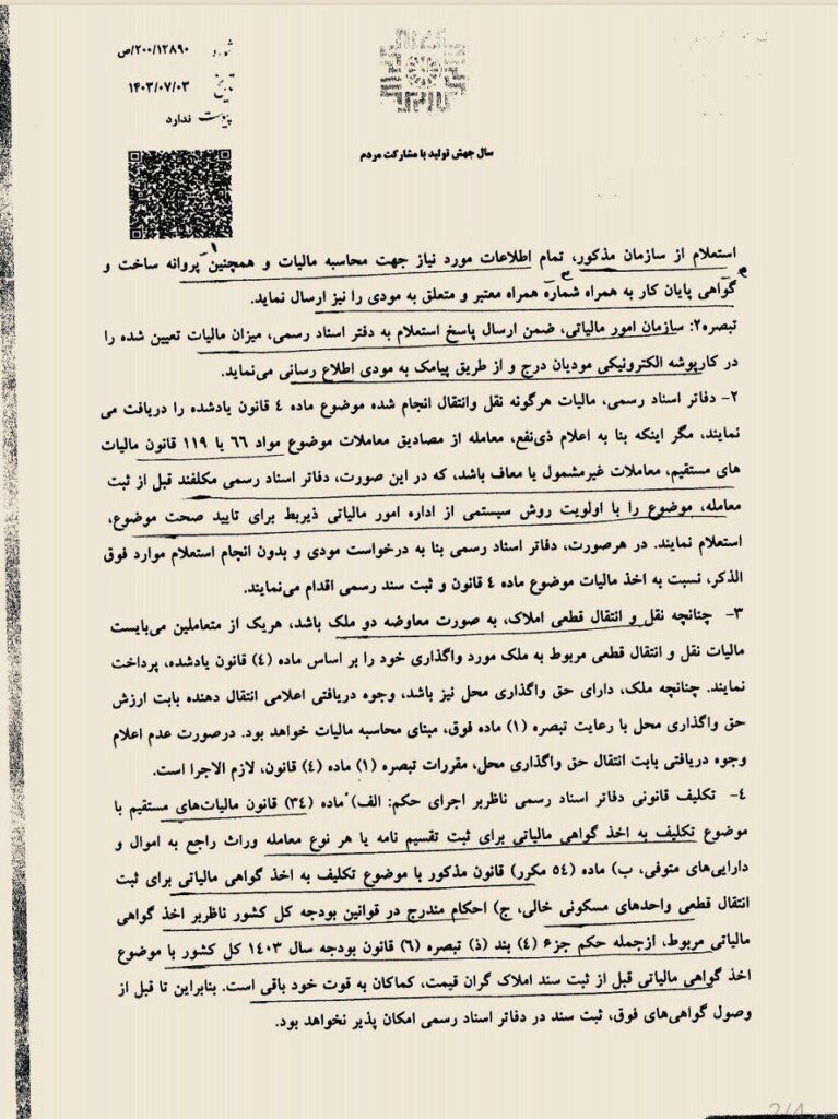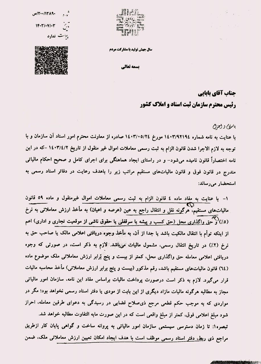 در تازهترین اخبار در حوزه مالیات و ثبت املاک، نامهای به تاریخ ۳ مهر ۱۴۰۳ از سوی سبحانیان، رئیس کل سازمان امور مالیاتی کشور، به ریاست سازمان ثبت اسناد و املاک کشور ارسال شد. در این نامه، جزئیات جدیدی در رابطه با نحوه اجرای احکام مالیاتی مندرج در قانون الزام ثبت رسمی معاملات اموال غیرمنقول مطرح شده است.