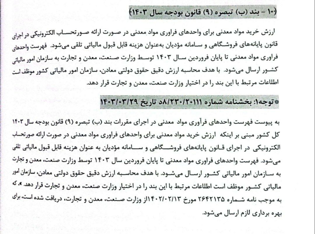 بر اساس بند (ب) تبصره (۹) قانون بودجه سال ۱۴۰۳، ارزش خرید مواد معدنی برای واحدهای فرآوری مواد معدنی، در صورتی که صورتحساب الکترونیکی صادر شود، بهعنوان هزینه قابل قبول مالیاتی تلقی خواهد شد.