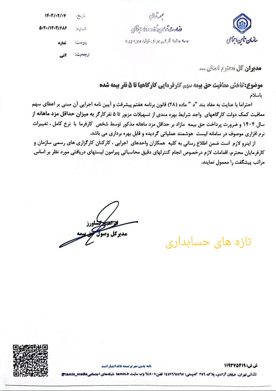در پی تغییرات جدید در قانون بیمه اجتماعی، معافیت حق بیمه سهم کارفرما برای کارگاههایی که کمتر از ۵ نفر کارگر دارند، کاهش یافته است. طبق این تغییرات، که در جهت حکمایت از کسب و کارهای کوچک و حمایت از مدیران این کسب و کارها اعمال شده است، کارفرمایان با تعداد نیروی انسانی کمتر از ۵ نفر که درآمد حق بیمه کارفرما را پرداخت نمیکنند.اما کارفرمایانی که با همین تعداد نیروی انسانی، درآمد سالانه آنها از حد مشخصی بیشتر باشد، دیگر از معافیت کامل بیمه برخوردار نخواهند شد. این تصمیم با هدف تنظیم دقیقتر منابع بیمهای و افزایش عدالت در حمایتهای اجتماعی اتخاذ شده است.