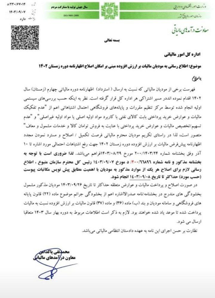 طبق بخشنامه رئیس کل سازمان امور مالیاتی، مودیان مالیاتی میتوانند اظهارنامه مالیات بر ارزش افزوده دوره زمستان سال ۱۴۰۲ را تا تاریخ ۱۲ اردیبهشت ۱۴۰۳ اصلاح و تکمیل کنند. این اقدام شامل ثبت خریدها و فروشهایی است که صورتحسابهای آنها در سامانه مودیان ثبت نشده باشد. همچنین مودیانی که این اصلاحات را تا مهلت مقرر انجام دهند، از بخشودگی ۱۰۰ درصدی جرایم مالیاتی مربوط به تأخیر بهرهمند خواهند شد.