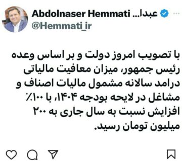 معافیت مالیاتی ۲۰۰ میلیون تومانی اصناف و مشاغل در ۱۴۰۴Behinehpardazanاکتبر 13, 2024به گزارش رسانه مالیاتی ایران، عبدالناصر همتی، وزیر امور اقتصادی و دارایی، در شبکههای اجتماعی اعلام کرد که بر اساس ... ادامه مطلب