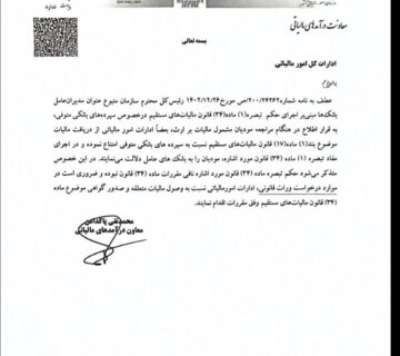 خبر: لزوم وصول مالیات بر ارث سپرده بانکی و صدور گواهی توسط ادارات مالیاتیBehinehpardazanاکتبر 6, 2024بر اساس تبصره ماده ۳۴ قانون مالیاتهای مستقیم، وصول مالیات بر ارث سپردههای بانکی و صدور گواهی موضوع این ماده ... ادامه مطلب