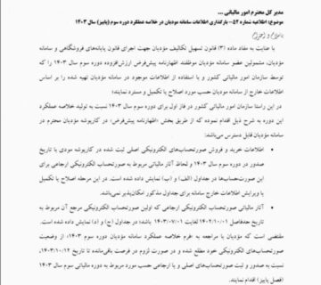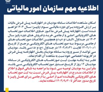 مشاهده اطلاعات سامانه مودیان در اظهارنامه پیشفرض پاییز ۱۴۰۳ فراهم شدBehinehpardazanدسامبر 24, 2024سازمان امور مالیاتی کشور اعلام کرد: مودیان از این پس میتوانند اطلاعات سامانه مودیان را بهصورت خودکار در اظهارنامه پیشفرض ... ادامه مطلب