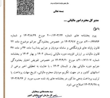 تمدید مهلت پرداخت جرایم مالیاتی بهار و تابستان ۱۴۰۳ تا ۲۸ آذرBehinehpardazanدسامبر 16, 2024در راستای تکریم مؤدیان مالیاتی و با توجه به تعطیلی اخیر برخی از استانهای کشور، سازمان امور مالیاتی اعلام کرد ... ادامه مطلب