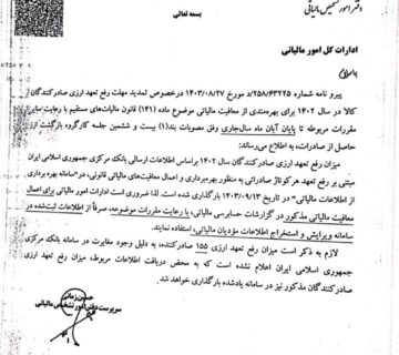 ۲۴ آذر آخرین مهلت تسلیم اظهارنامه دوره بهار سال ۱۴۰۳Behinehpardazanدسامبر 10, 2024سازمان امور مالیاتی تأکید کرده است که آخرین مهلت برای تسلیم اظهارنامه مالیات بر ارزش افزوده دوره بهار سال ۱۴۰۳، ... ادامه مطلب