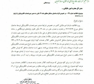 الزام اشخاص حقیقی با فروش بالای ۱۴۴ میلیارد ریال به صدور و ارسال فاکتور از دیماه ۱۴۰۳Behinehpardazanنوامبر 27, 2024بر اساس ابلاغیه جدید سازمان امور مالیاتی، اشخاص حقیقی که میزان فروش آنها تا پایان شهریورماه ۱۴۰۳ از سقف ۱۴۴ ... ادامه مطلب