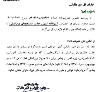 پذیرش هزینه کرد موسسات دارای مجوز جذب دانشجویان بین المللی به عنوان هزینه قابل قبول مالیاتیBehinehpardazanنوامبر 11, 2024ماده 15 آییننامه تسهیل جذب دانشجویان بینالمللی که در تاریخ 4 تیر 1403 توسط هیئت وزیران مصوب شده، به موضوع ... ادامه مطلب