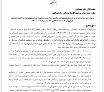 ایجاد شفافیت در معافیت مالیاتی شرکتهای حمل و نقل: درخواست از شورای گفتوگوی استان سمنانBehinehpardazanاکتبر 30, 2024📌 در پی درخواست واصله از دبیرخانه شورای گفتوگوی استان سمنان، موضوع ایهام و ابهام در خصوص معافیت شرکتهای حمل ... ادامه مطلب
