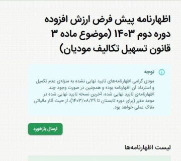 رئیس کل سازمان امور مالیاتی کشور اعلام کرد: مهلت ارائه اظهارنامه عملکرد سال ۱۴۰۳ برای صاحبان مشاغل تا پایان مردادماه ۱۴۰۴ تمدید شده است.