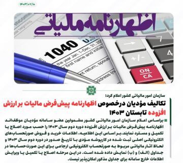 تکالیف مؤدیان درخصوص اظهارنامه پیشفرض مالیات بر ارزش افزوده تابستان 1403Behinehpardazanاکتبر 2, 2024با توجه به اعلام سازمان امور مالیاتی کشور، مؤدیان محترم توجه داشته باشند که تکالیف جدیدی برای اظهارنامه پیشفرض مالیات ... ادامه مطلب