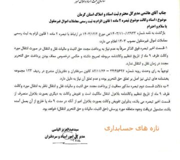 ابلاغ قریبالوقوع آییننامه اجرایی ماده ۱۰ قانون الزام به ثبت رسمی معاملات اموال غیرمنقولBehinehpardazanآوریل 16, 2025در پی تصویب قانون الزام به ثبت رسمی معاملات اموال غیرمنقول که از سوم تیرماه ۱۴۰۳ به مرحله اجرا گذاشته ... ادامه مطلب