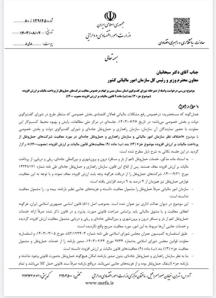 📌 در پی درخواست واصله از دبیرخانه شورای گفتوگوی استان سمنان، موضوع ایهام و ابهام در خصوص معافیت شرکتهای حمل و نقل از پرداخت مالیات بر ارزش افزوده مورد بررسی قرار گرفت. این موضوع به ویژه به جزء ۱۳ بند (ب) ماده ۹ قانون مالیات بر ارزش افزوده مصوب سال ۱۴۰۰ مرتبط است و نیاز به شفافسازی دارد.
